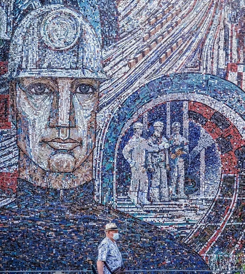 Large mosaic wall with Mining theme. The 70s. Vulcan Artists: Elena Bianu, Iosif Tellman (c) Bacu